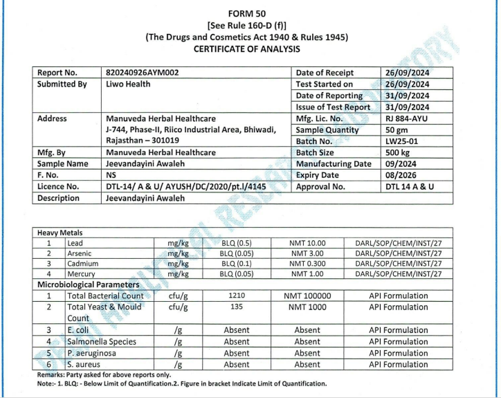 Liwo Jeevandayini Awaleh is free from sugar, benzene, and heavy metals, designed to revitalize your energy, stamina, and strength from within, empowering you to feel unstoppable and conquer each day. Say goodbye to fatigue and embrace boundless energy with Jeevandayini Awaleh, a time-honored Ayurvedic formulation perfected over four decades. Engineered to elevate your energy, stamina, and strength, it’s your natural ally for peak performance—physically, mentally, and beyond. Meticulously crafted in small batches, Jeevandayini Awaleh combines 24 powerful herbs, including Shuddha Shilajit, Ashwagandha, Safed Musli, and Kaunch Beej, to help unlock your body’s full potential.